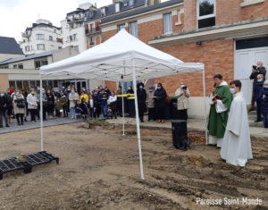 Bénédiction et pose de la première pierre lors du lancement des travaux en octobre 2020. (Paroisse de Saint-Mandé)