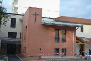 Façade avec croix visible, du centre paroissial Saint-Jean-Paul-II à Colombes