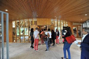 Entrée de l'église restaurée en bois.
