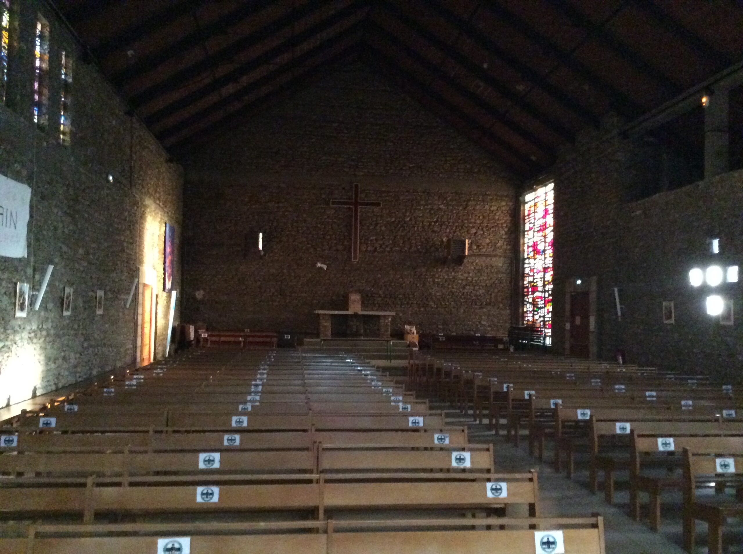 La nef de l’église du Sacré-Coeur de Ris-Orangis (91). Sur le mur du fond, les deux aérothermes aussi inefficaces que bruyants. (SG/CDC)