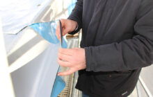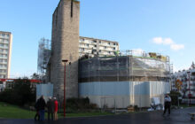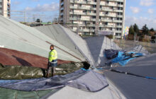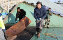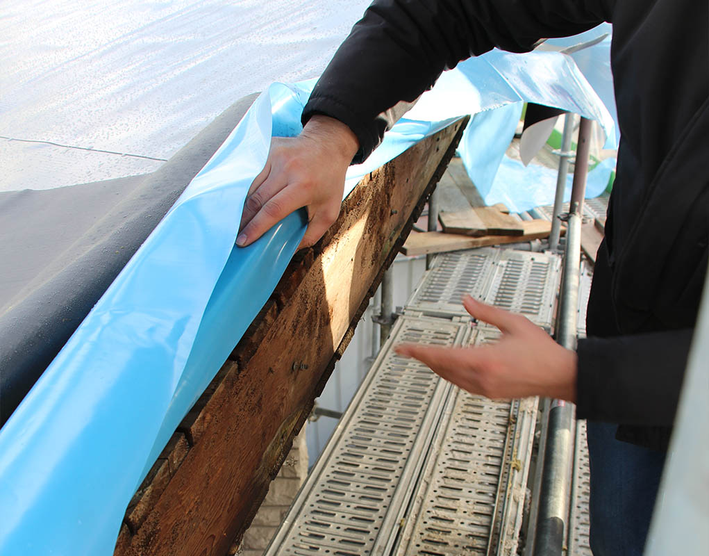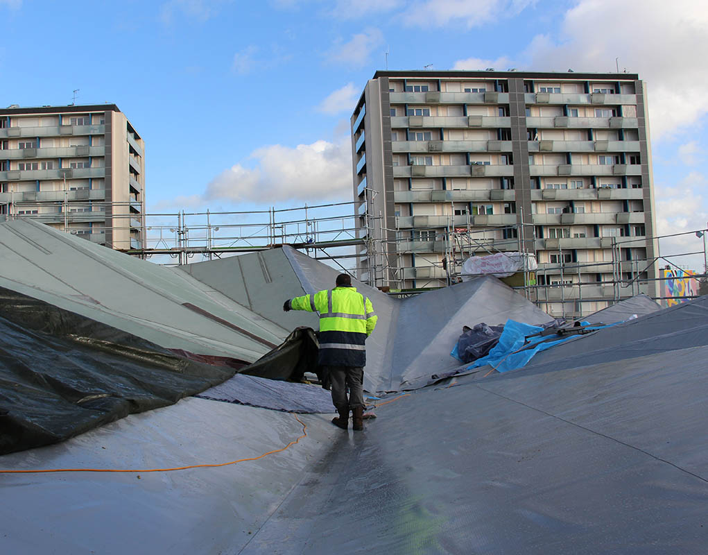 Le chantier est réalisé en quelques mois : les ouvriers ôtent les anciennes couvertures en cuivre et posent la nouvelle membrane étanche. Eglise St-François d'Assise, Gonesse. (CDC)