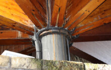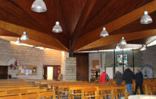Au centre de la toiture en parapluie, les eaux de pluie débordent du système d'évacuation. Les travaux sont nécessaires. Eglise St-François d'Assise, novembre 2022. (CDC)