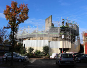 Érigée dans les années 1960, l’église Saint-François d’Assise à Gonesse. Travaux sur le toit en novembre 2022. (CDC)