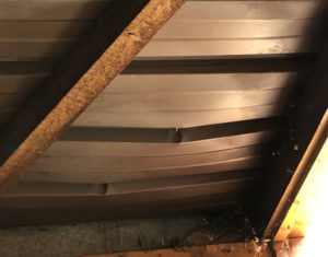 La toiture est composée de plaques en acier qui se sont déformées et laissaient passer l’eau de pluie.