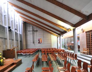 L’église Sainte-Marie a une architecture particulière, avec un toit d’un seul versant. Credit CDC