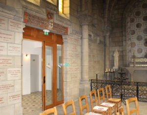 Vue d’une ouverture créé depuis l’église vers les salles paroissiales.