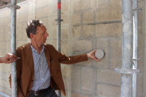 L’architecte conseil Bernard Bauchet, spécialisé dans le béton armé, travaille avec le cabinet Lacoste et Thieulin sur la rénovation de l’église du Raincy. Ici examen d’un coloris de béton avant restauration. (CDC)