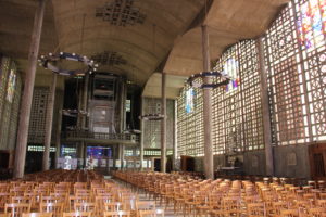 Vue intérieure de Notre-Dame du Raincy, au fond sur la tribune, l’orgue a été protégé pour toute la durée du chantier. (CDC)
