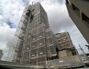 Pour restaurer le clocher de l’église Notre-Dame du Raincy, un échafaudage de plusieurs mètres est nécessaire. (GF/CDC)