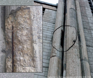 Exemple de dégradation du béton sur le clocher de Notre-Dame du Raincy. (Eglise ND du Raincy – Auguste Perret UFSE SAIF, 1923)