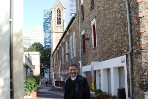 Le père Philippe Capelle, curé de Saint-Hippolyte, devant le clocher de l’église.