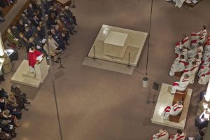 Afin de relier le chœur et la nef de l’église, les marches ont été supprimées et remplacées par une pente douce, avec une allée centrale qui permet de passer de la célébration à l’adoration.