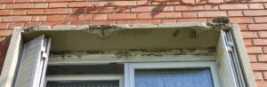 Des bétons des tableaux de fenêtres explosés et des volets rouillés