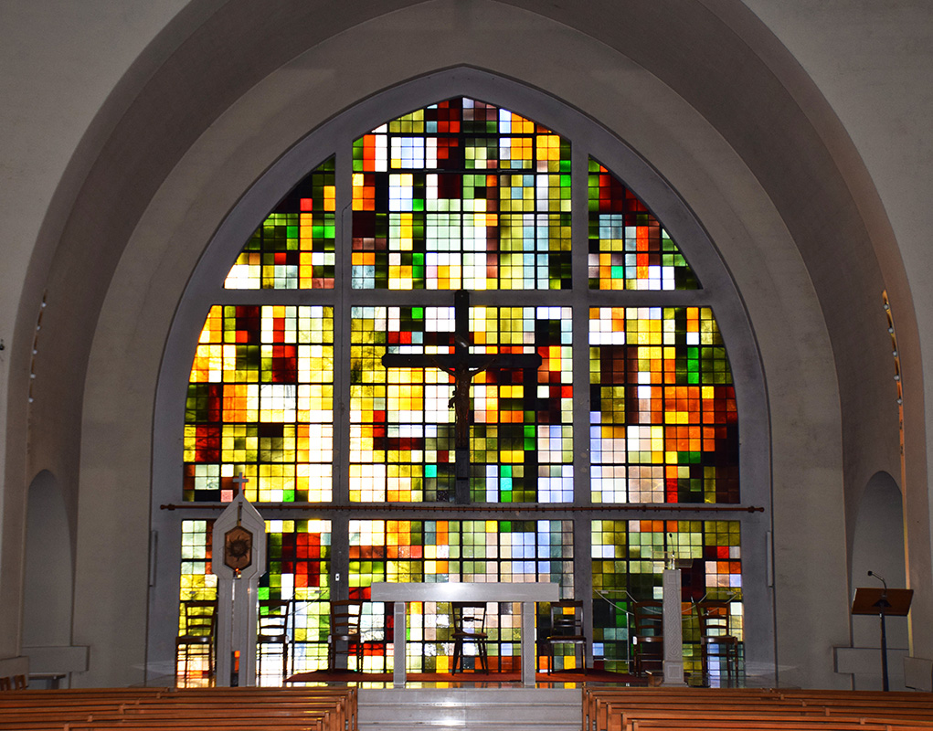 Le mur vitrail est l’œuvre de Paul Bony dans les années 1950.