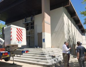 Les marches et la porte monumentale de l’église en cours de rénovation.