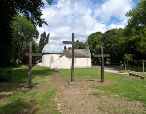 Les trois croix de bois marquant le miracle des marchands dans le bois de Clichy ont été installées près de la chapelle Notre-Dame des Anges à Clichy. (GF/CDC)