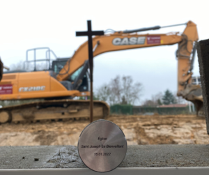 Bénédiction de la première pierre de l’église St-Joseph-le-Bienveillant à Montigny-Voisins-le-Bretonneux (78) le 16 janvier 2022 (CDC).