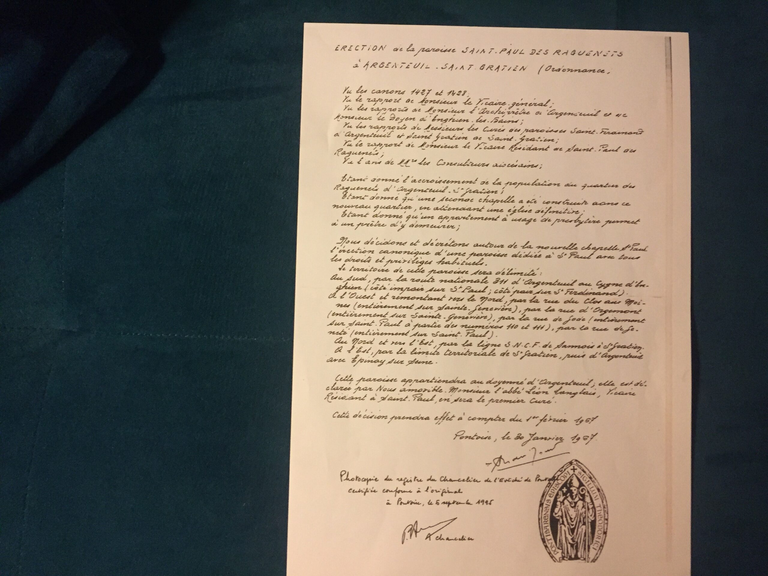 Décret d’érection de la paroisse Saint-Paul des Raguenets à Saint-Gratien (95) signé par l’évêché de Pontoise le 30 janvier 1967. (Février 2023) (PSM/CDC)