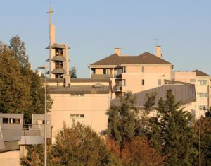 L’église est au premier niveau, les niveaux inférieurs accueillent des salles de réunions et de stockage.