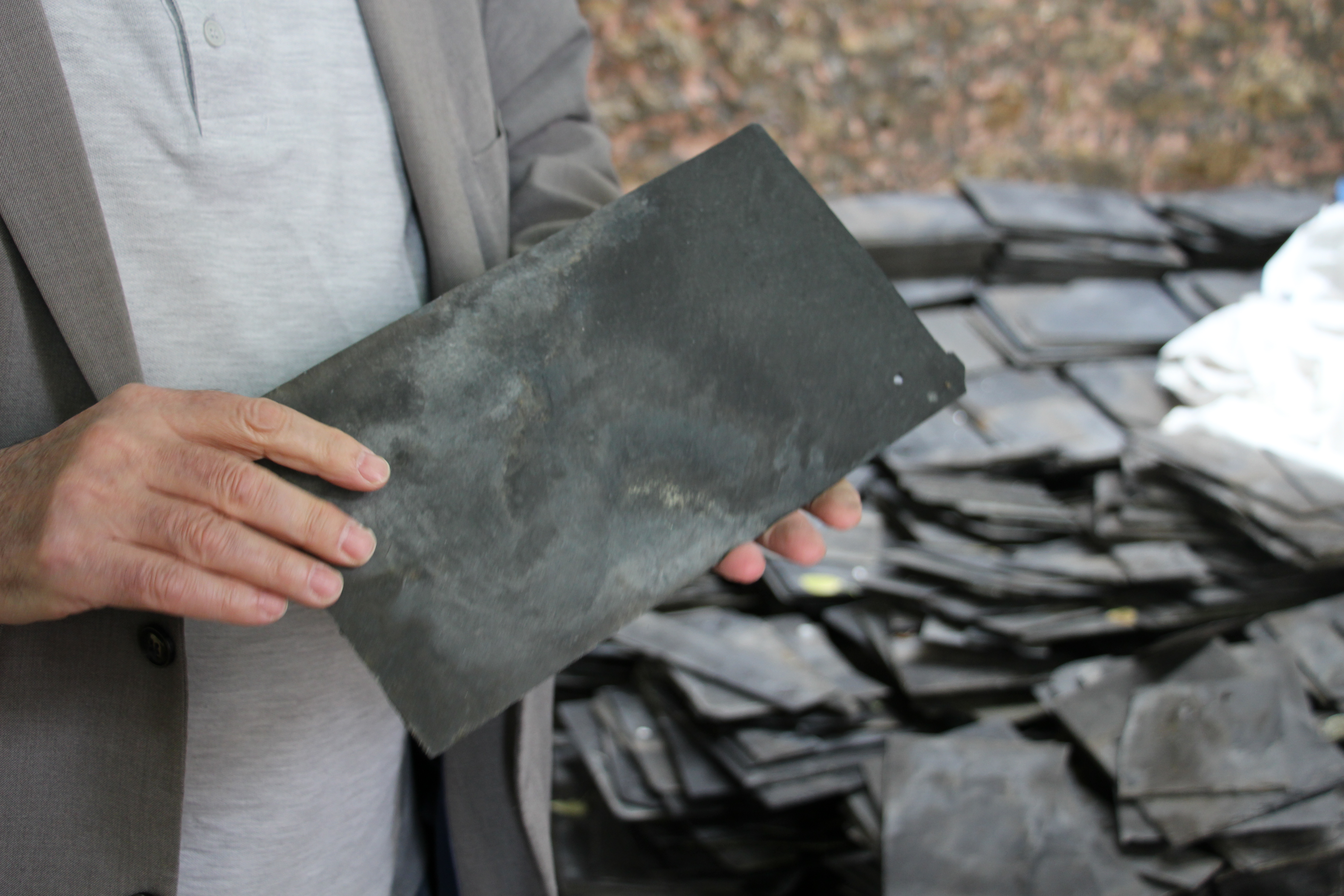 Les ardoises anciennes sont ôtées du toit, elles ne sont plus assez étanches. (Crédit CDC)