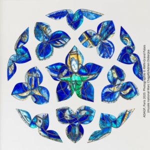 Marc Chagall en collaboration avec Charles Marq, La rose bleue, œuvre exécutée par l’atelier Simon-Marq, Reims, vitrail d’étude pour la rosace du déambulatoire de la cathédrale de Metz, daté et signé en 1964. Verre et plomb, D. 205 cm. Centre national des arts plastiques/Fonds national d’art