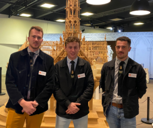 Armand Dumesnil,, Valentin Pontarollo et Yann Férottin, les trois Compagnons, auteurs de la maquette reconstituant la charpente de Notre-Dame de Paris. (CDC)