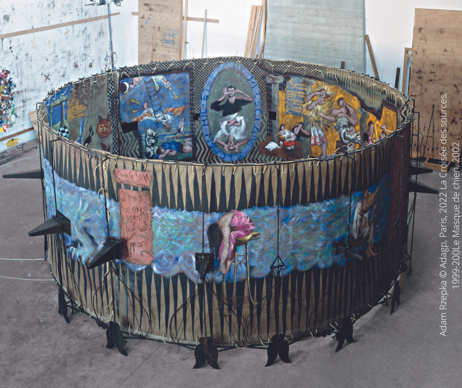 La Dive Bacbuc, 1998 Acrylique sur toile et structure en fer battu H. : 285 × diam. : 752 cm (toile : h. : 270 × diam. : 600 cm) Collection particulière, France Photo © Adam Rzepka © Adagp, Paris, 2022 La Croisée des sources, 1999-200Le Masque de chien, 2002.