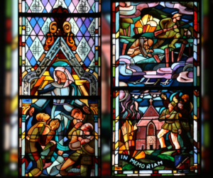 Vitrail du Bon Conseil à Paris. À gauche la partie haute ( montre la Vierge accueillant les soldats. La partie basse (à droite) montre le bombardement de l’église ND du Bon Conseil en 1944. (CM)