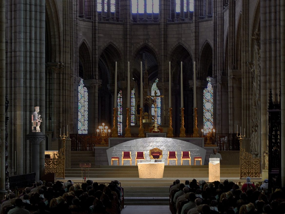 L’installation précédente était peu pratique, voire dangereuse durant les grandes célébrations. Composée d’un podium en aggloméré et d’un autel simple en contre-plaqué, elle s’avérait indigne de cette basilique royale, de plus siège de l’évêque. Le nouvel aménagement ponctuait les grands travaux de restauration effectués sur la façade, dans le chœur et dans la crypte, engagés par l’État en 2012 et 2015.