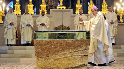 14 janvier 2018, Monseigneur Pascal Delannoy oint le nouvel autel de la cathédrale basilique de Saint-Denis. (CDC/Gil Fornet)