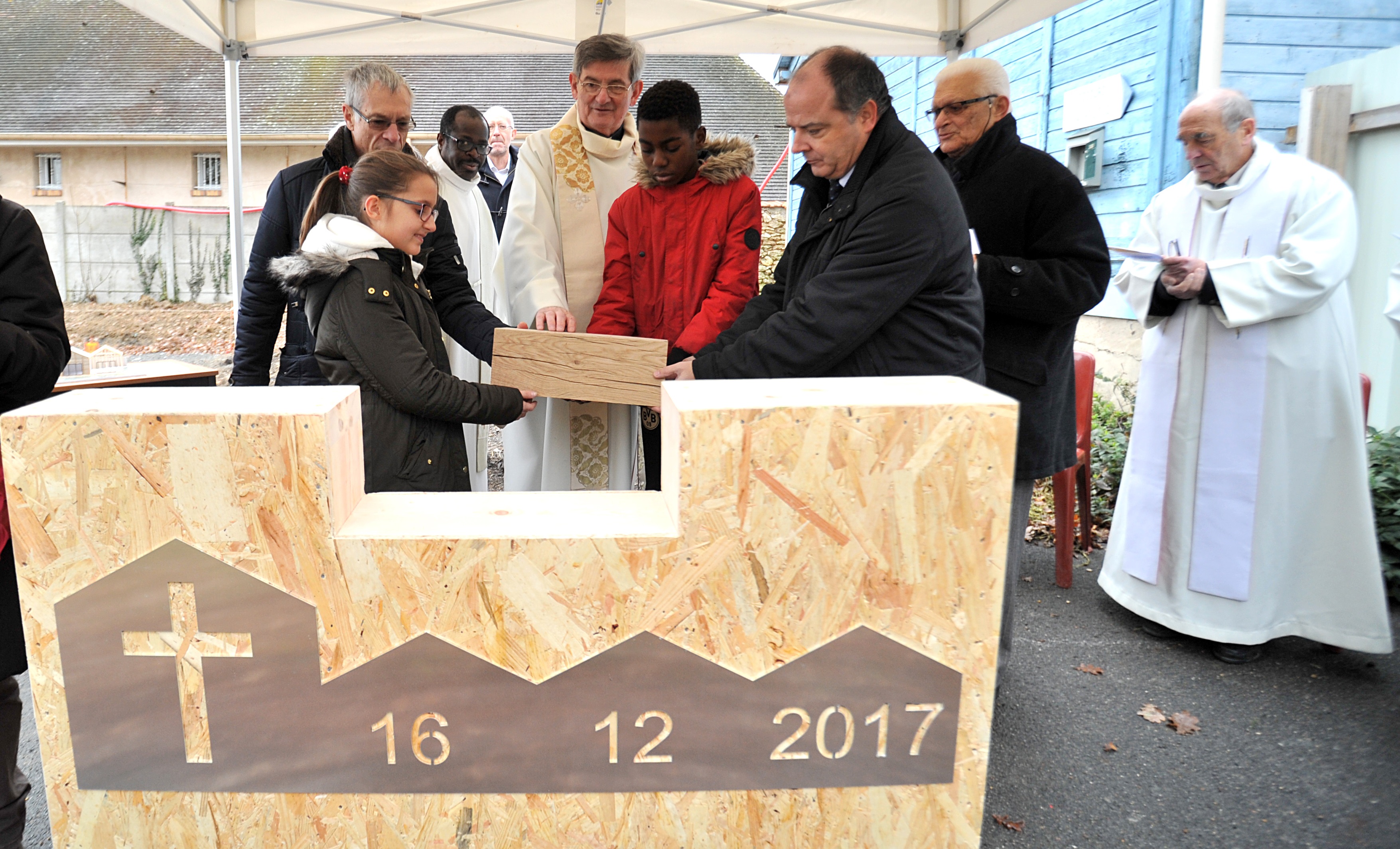 Didier Dousset, maire du Plessis-Trévise, pose la première planche de la maison Saint-Jean-Baptiste sous l’œil du père Henri Gagey, vicaire général de Créteil.
