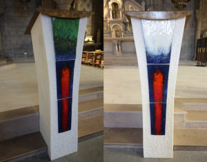 Les plaques d’émail disposées sur l’ambon peuvent être modifiées en fonction du temps liturgique.