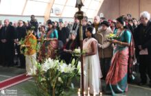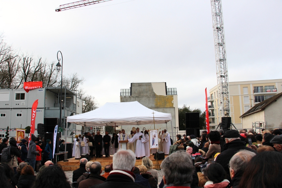Mgr Nahmias, évêque de Meaux accompagné du nonce apostolique Mgr Celestino Migliore, et Mgr Guillaume de Lisle, évêque auxiliaire de Meaux, préside la cérémonie. Ils sont entourés de nombreux prêtres et diacres de la paroisse de Chelles, en présence du vice-président du Conseil départemental, des personnalités, des habitants, des donateurs, des familles, des enfants et des jeunes, des paroissiens et des ouvriers de l’entreprise de bâtiment qui ont débuté les fondations depuis un mois. Il fait 3° dehors, mais il fait bien chaud dans les cœurs.