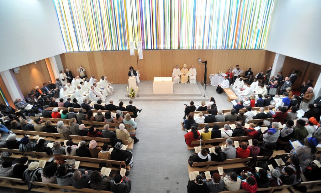 Mgr Stanislas Lalanne, évêque de Pontoise, consécre l'église Saint-Joseph à Montigny-lès-Cormeilles (Val-d'Oise) le 5 mai 2019. Le mur vitrail de Thierry Boissel représente la multicuturalité de la communauté paroissiale.