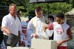 Mgr Pascal Delannoy pose la première pierre de la maison paroissiale Saint-Pierre-Saint-Paul de Montfermeil avec un jeune garçon.