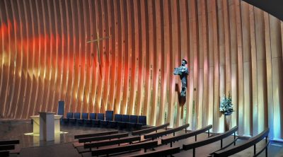 Les deux vitraux qui illuminent cet espace proviennent de l’ancienne cathédrale tout comme le mobilier liturgique, autel et ambon. Ces éléments marquent la continuité avec l’histoire de ce lieu.