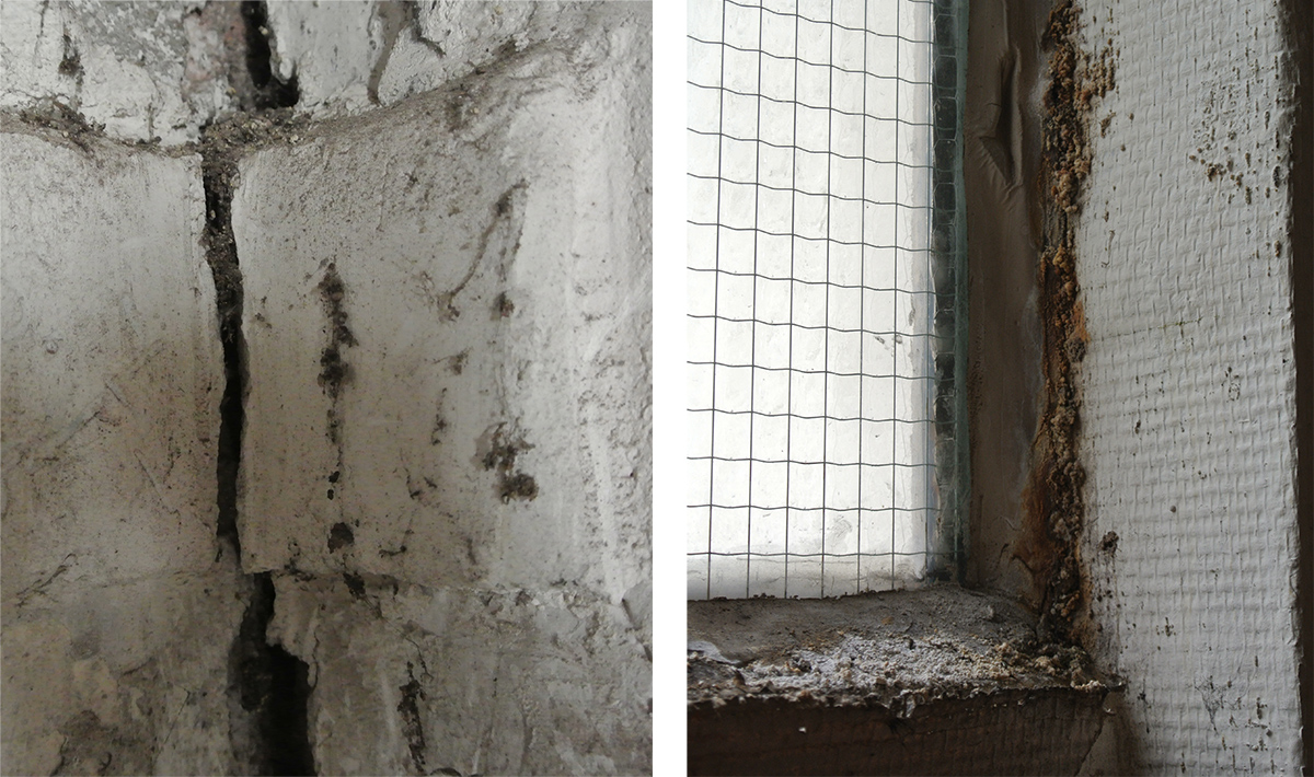Une fissure verticale était aussi bien visible de part et d’autre du clocher, en limite avec les deux corps de bâtiment construits ultérieurement dans les 1960 et 1970. Cette fissure, voir cette crevasse était traversante. La façade Est présentait des décollements d’enduits, en partie basse de la façade, sur l’ensemble de son linéaire, mettant à nu le support de brique pleine. Il n’existait pas de grillage d’accroche, ce qui explique que le vieillissement aidant, la couche d’enduit supérieure se décollait du support.