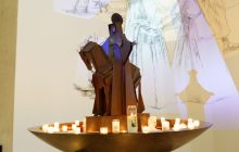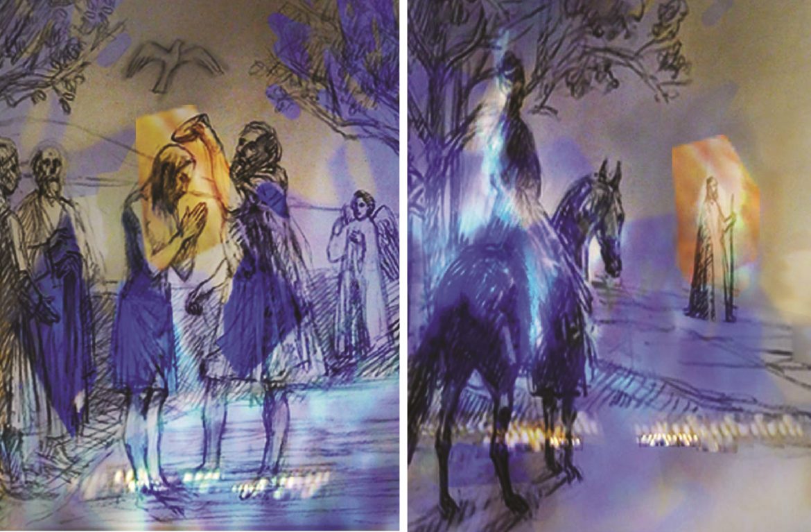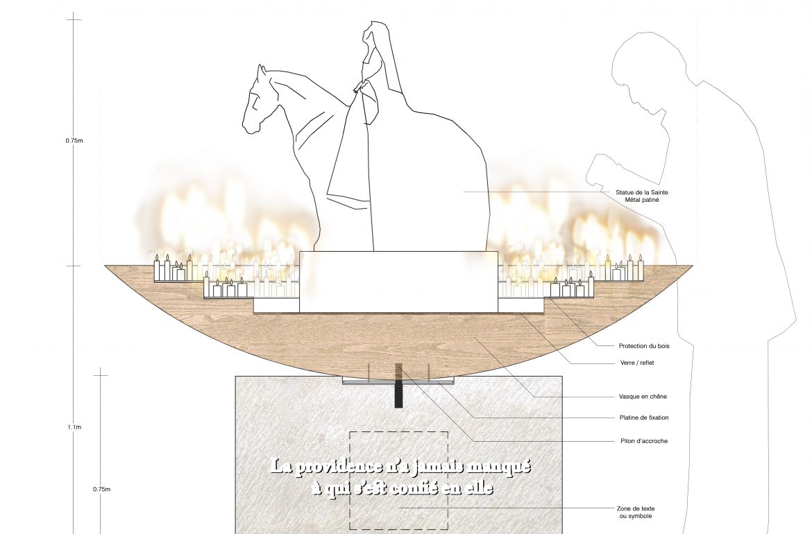 Deux fresques numériques orneront les chapelles latérales. Réalisées en grisaille et colorisées grâce à des projecteurs, elles surplomberont deux vasques en chêne et en cuivre. A gauche, côté Boulogne, une représentation de la sainte à cheval, à droite, côté Paris, le baptême du Christ.