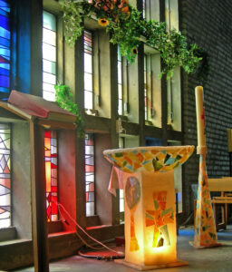 L’intérieur de l’église Sainte-Monique est remarquable par ses dalles de verre coloré et ses fonds baptismaux en mosaïque.