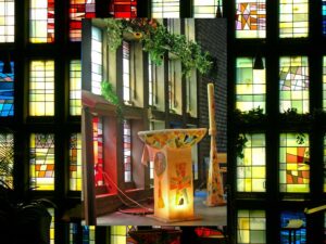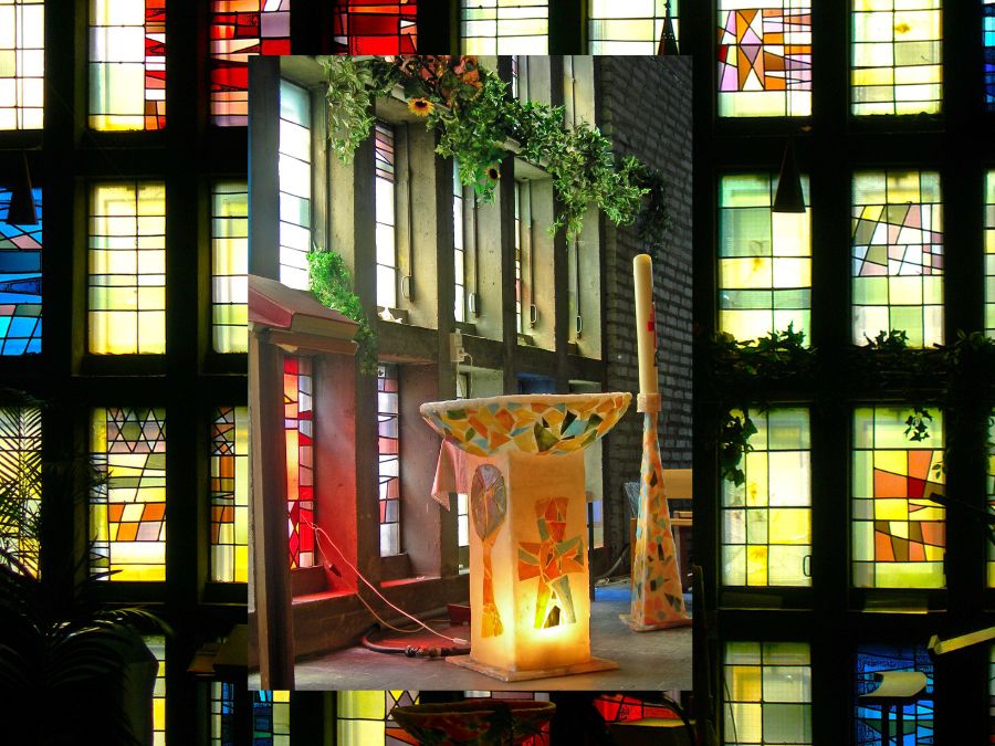 L’intérieur de l’église Sainte-Monique est remarquable par ses dalles de verre coloré et ses fonds baptismaux en mosaïque.