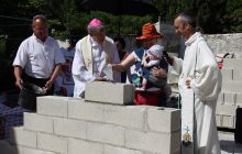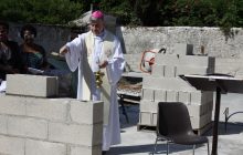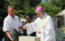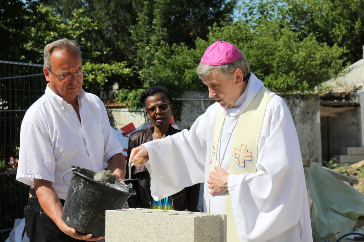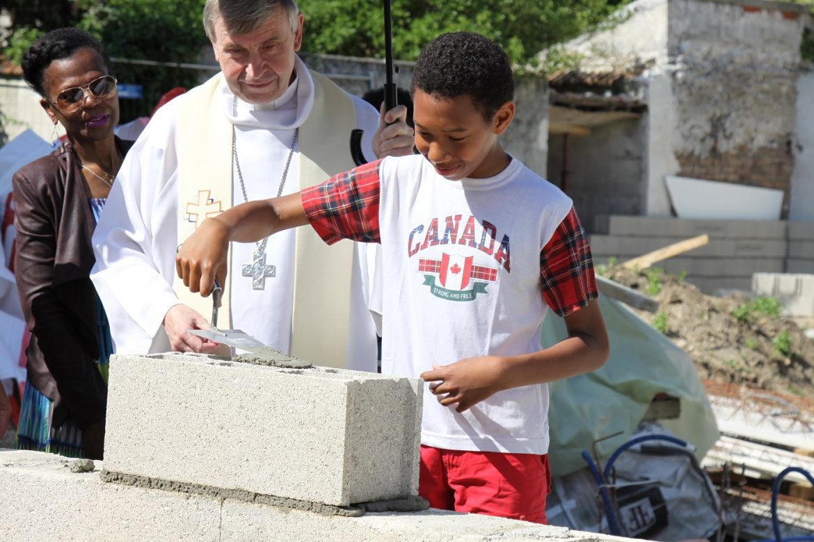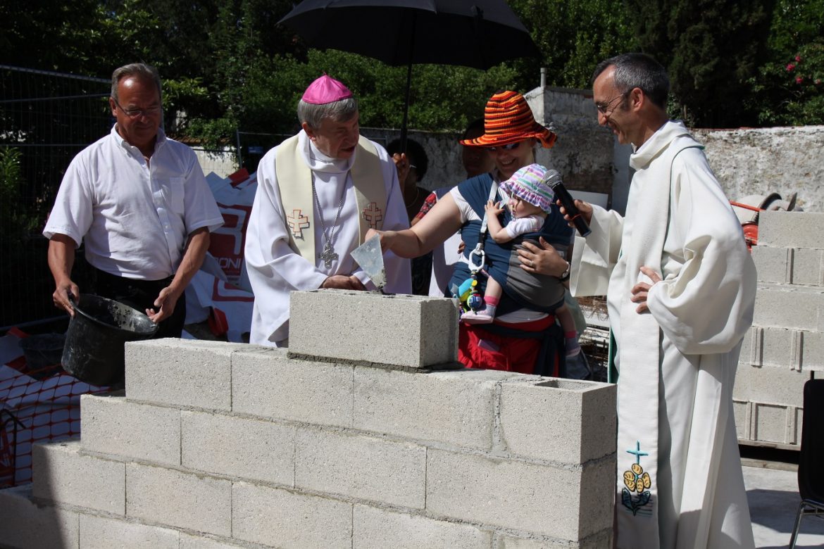 17 juin 2017 Mgr Pascal Delannoy pose la première pierre de la maison paroissiale Saint-Pierre-Saint-Paul de Montfermeil avec un jeune garçon.