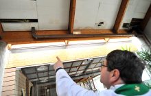 Le père Jean-Marc Pimpaneau montre les dommages de la toiture de l’église Sainte-Marie-des-Peuples à Cergy-le-Haut. (Crédit Gil Fornet/CDC)