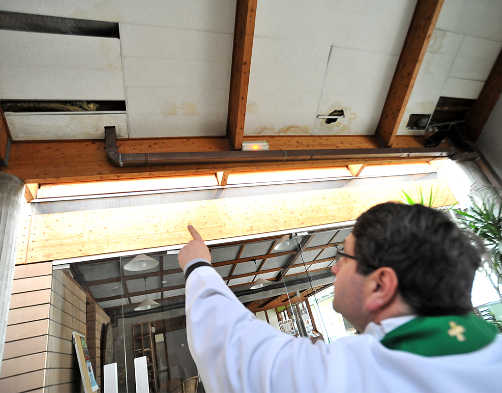 Voilà plusieurs années que des taches d’humidité sont apparues ! Leur cause : des infiltrations provoquant une dégradation progressive de la toiture et de l’isolation thermique. L’église Sainte-Marie-des-Peuples à Cergy-le-Haut – comme de nombreuses autres églises du Val-d’Oise – a été bâtie dans les années quatre-vingts avec une conception de toiture problématique. Rapidement, des fuites sont intervenues lors d’épisodes de pluie violente. Une large partie de celle-ci est à revoir de façon urgente.