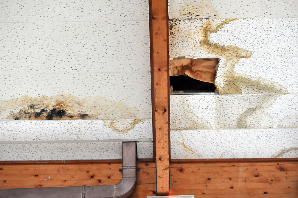 Dégradations de la toiture de l’église Sainte-Marie-des-peuples à Cergy-Le-Haut (Val-d’Oise). (Gil Fornet/CDC)