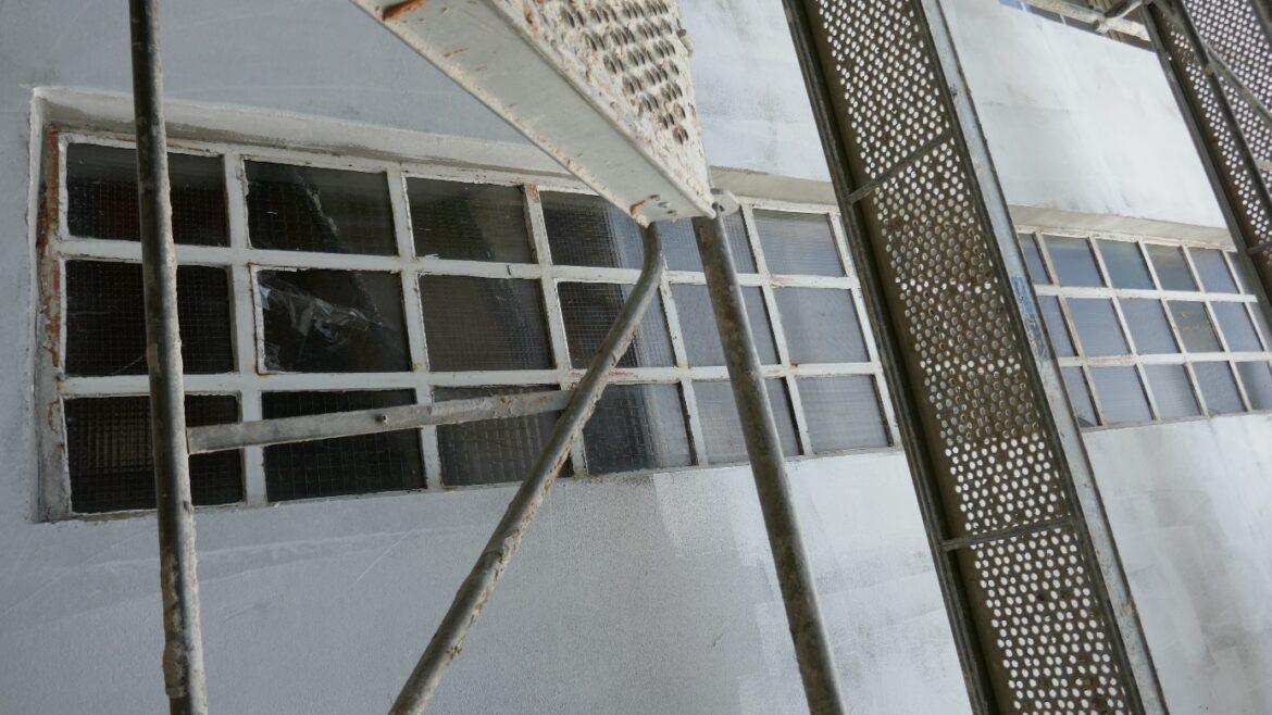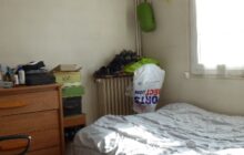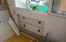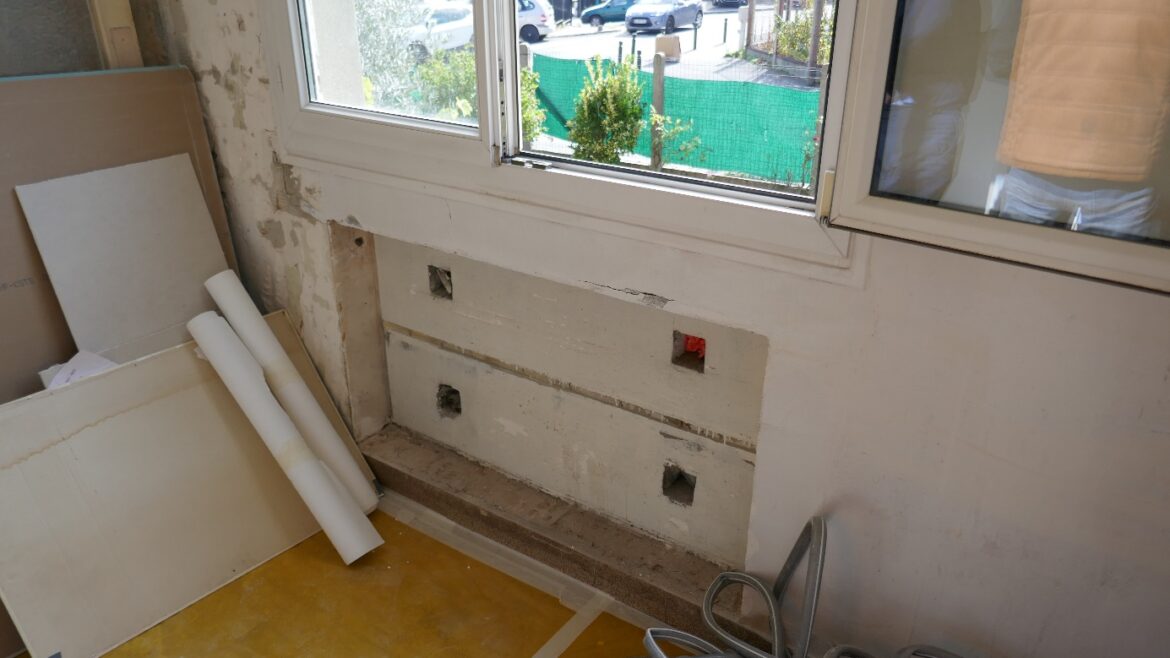 La cuisine en cours de rénovation et la niche de l’ancien radiateur en attente d’isolation