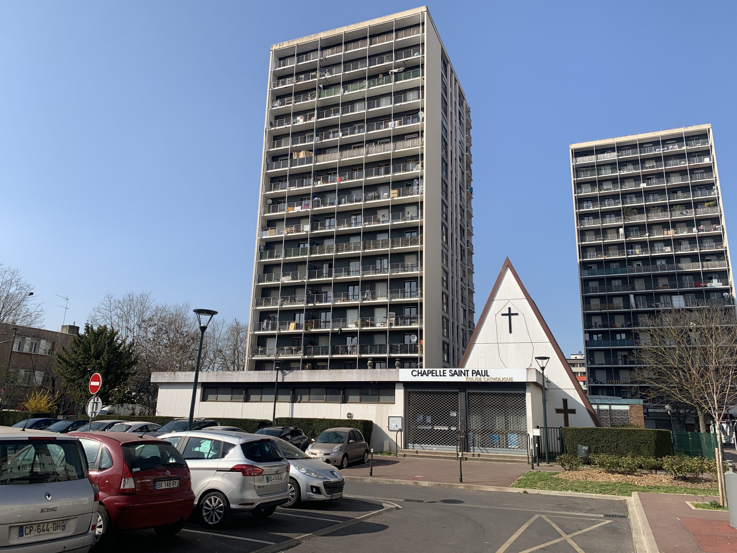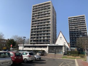 Avec son toit en forme de tente, la chapelle Saint-Paul des Raguenets se distingue au coeur de la cité HLM à Saint-Gratien/Argenteuil (95) (Crédit paroisse) décembre 2022)