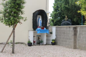 Dans la cour du presbytère qui reste ouverte en journée, une statue de la Vierge devant laquelle les riverains se recueillent. Presbytère de Garges-les-Gonesse (CDC)