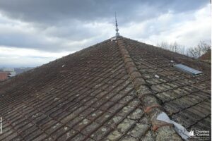 Vue extérieure de la toiture recouverte de mousses et de lichens