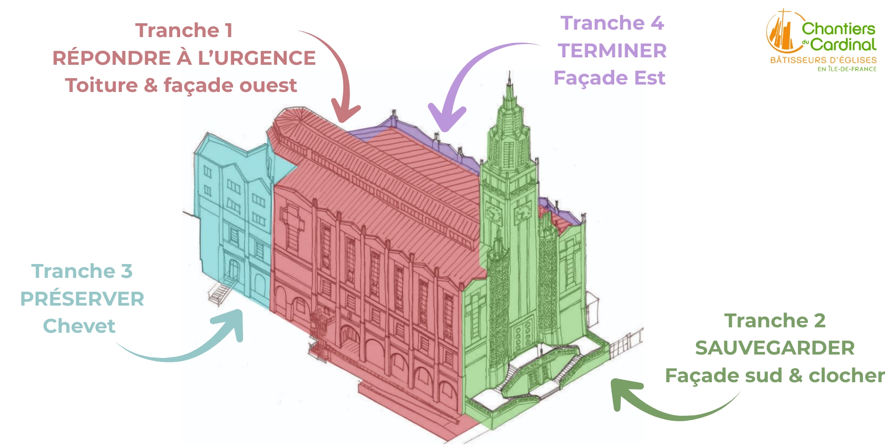 L’année 2025 est consacrée aux études et l’année 2026 sera celle des premiers travaux. Les objectifs à atteindre sont multiples et lourds d’enjeux : mettre hors d’eau et remplacer les sur-toitures et la charpente; sécuriser l’accès en toiture pour assurer la maintenance; stopper la chute des claustras en béton, pour la sécurité des paroissiens; expérimenter un protocole de restauration des façades, et enfin, conserver ce patrimoine du Diocèse de Paris.